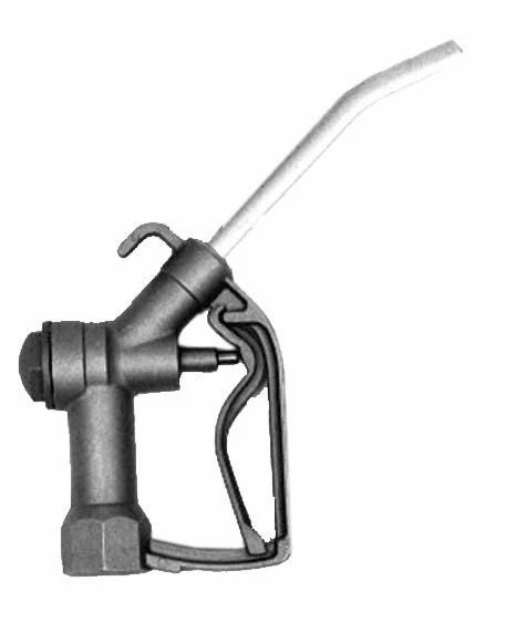 Curved Manual Fuel Nozzle. A aluminum die-cast, pressure type utility nozzle for farm and industry. Has a 1″ inlet and 3/4″ outlet fill pipe for unleaded gasoline.
