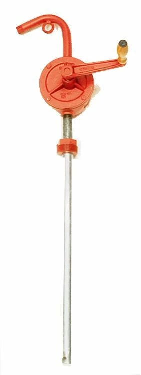 Rotary pump. Heavy-duty and multi-directional. Telescoping suction tube to fit various size containers. Cast iron, with self adjusting vanes. Pumps in either direction by a few reverse turns of the handle, one gallon per 10 revolutions. Comes complete with threaded 3/4″ NPT (Male) discharge spout and bung adapter for 2″ steel drum openings. These pumps will siphon to a lower level.