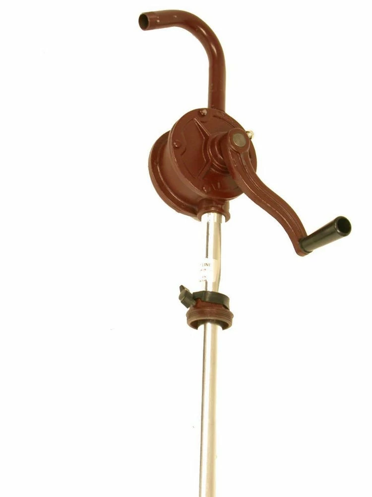 Rotary Hand Pump – fits 15 through 55-gallon drums with 2″ bung opening. A rotary vane type pump for dispensing gasoline, diesel fuel, and similar light petroleum products. Heavy-duty cast iron body, dual vanes, and bung adapter. Discharge spout threaded 3/4-inch NPT (Male). Dispenses approximately 7-1/2 gallons per 100 revolutions.