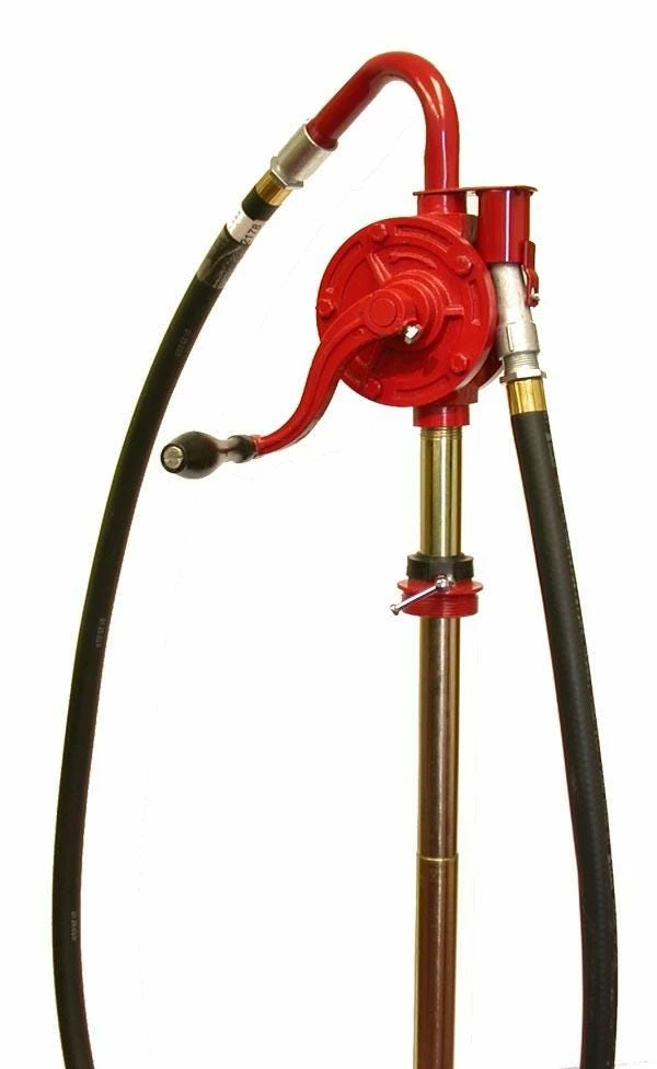 Economy Rotary Pump – fits 15 through 55-gallon drums with 2″ NTP bung opening. Dispenses gasoline, diesel fuel, ATF, Light oils, and hydraulic oil. Heavy-duty cast iron body with 3 piece steel suction tube 3/4 inch threaded discharge spout (M). Includes MODEL 2178 hose assembly and MODEL 53 holster. Dispenses approximately 7-1/2 gallons per 100 revolutions.