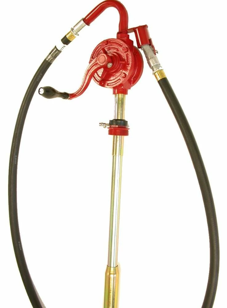 Rotary Pump – Fits 15 to 55 gallon drums with 2″ bung opening. Dispenses gasoline, diesal fuel and similar light petroleum products. Constructed of cast iron. Includes telescoping tube assembly 2″ NTP bung adapter, 3/4″ threaded NPT discharge spout, 8 ft. X 3/4″ rubber hose nozzle. Dispenses 7.5 gallons per 100 revolutions (8-oz. per revolution).