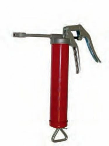 Pistol style grease gun. Heavy duty pistol gun with steel pipe and coupler. Can develop 5,000 pounds of pressure. Filled by 14-1/2-ounce grease cartridge, filler pump or suction.